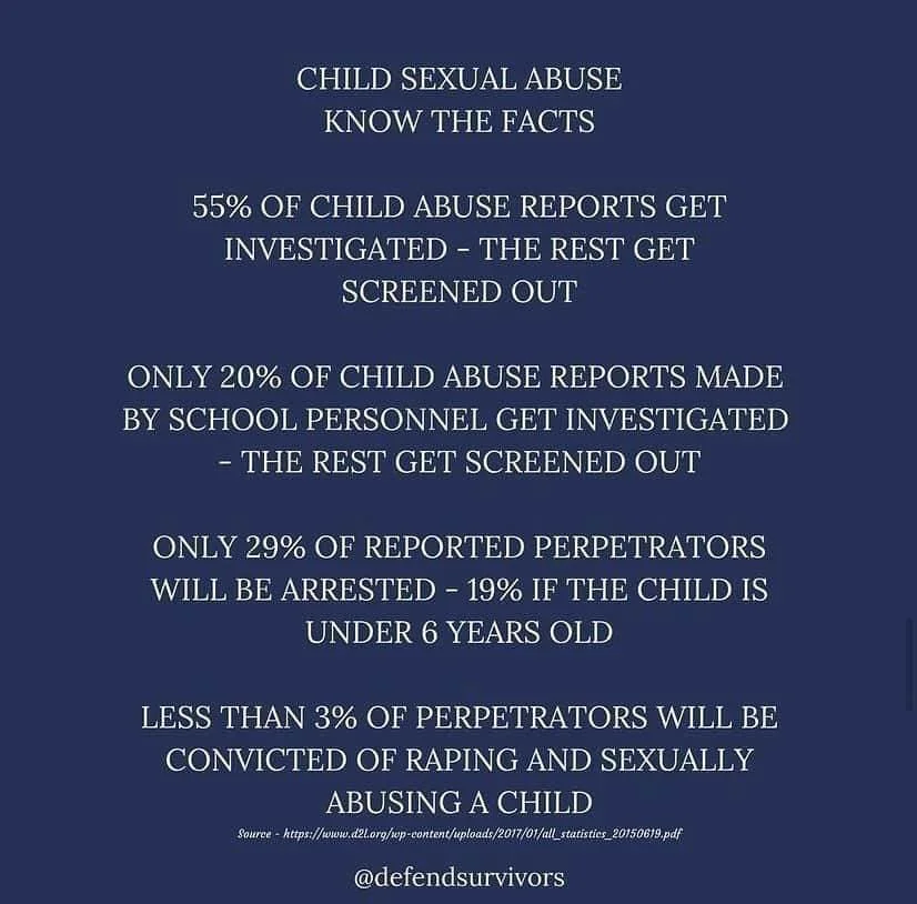 While the statistics above depict child sexual abuse alone, familial trafficking is even more difficult for law enforcement to hold offenders accountable. Primarily due to the effects of the intense abuse endured by the victim starting at a very young age, these victims have difficulty coming forward until sometimes decades after the events have occurred, making it difficult for law enforcement to procure witness testimony and evidence. These victims are typically entangled, stalked, and threatened by the trafficking parent well into adulthood, making it extremely challenging to report, let alone self-identify as victims and make sense of their own experiences. Disclosing the abuse risks the breakdown of relationships with siblings and the enabling parent. In addition, society tends to paint individuals who are not in contact with family members in a bad light or not “family oriented.” This begs the question - is it worth coming forward when the odds of the perpetrator being held accountable are less than 3%?